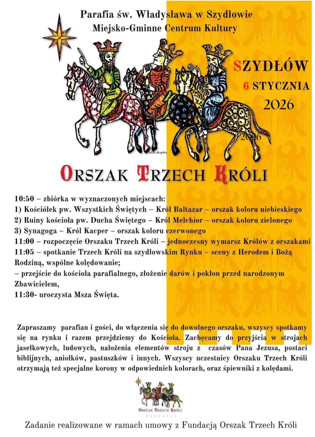 Bardzo serdecznie zapraszamy wszystkich naszych Parafian i czcigodnych Gości w dniu 6 stycznia na Orszak Trzech Króli. Już po raz kolejny nasza Parafia organizuje go wraz z Miejsko-Gminnym Centrum Kultury w Szydłowie. O godzinie 10.55. zgromadzimy się w 3 różnych miejscach: przy Kościele Wszystkich Świętych, przy Kościele Ducha Świętego (przy cmentarzu), i przy Synagodze. Tam będą Królowie, (każdy w innym miejscu), którzy ze swoim orszakiem wyruszą o 11.00. na Rynek. Tu będzie spotkanie Trzech Króli i wspólne kolędowanie, a później udamy się do kościoła parafialnego, gdzie ok. 11.30 rozpocznie się uroczysta Msza święta. Każdy Król symbolizujący inny kontynent, będzie miał swój orszak w innym kolorze. Król Kacper, symbolizujący Europę, rozpocznie orszak w kolorze czerwonym przy synagodze; Król Melchior, reprezentujący Azję, zaczyna orszak w kolorze zielonym przy ruinach kościoła Ducha Świętego; a król Baltazar z Afryki, gromadzi orszak w kolorze niebieskim przy kościele Wszystkich Świętych. Zapraszamy wszystkich bez wyjątku parafian i gości, do włączenia się do dowolnego orszaku, wszyscy i tak spotkamy się na rynku i razem przejdziemy do Kościoła. Zachęcamy do przyjścia w strojach jasełkowych, ludowych, nałożenia elementów stroju czasów Pana Jezusa, postaci biblijnych, aniołków, pastuszków i innych tego typu. Uczestnicy Orszaku Trzech Króli otrzymają też specjalne korony w odpowiednich kolorach, oraz śpiewniki z kolędami. Raz jeszcze bardzo serdecznie zapraszamy wszystkich i prosimy o punktualne przybycie na 10.55. do jednego ze wskazanych miejsc.